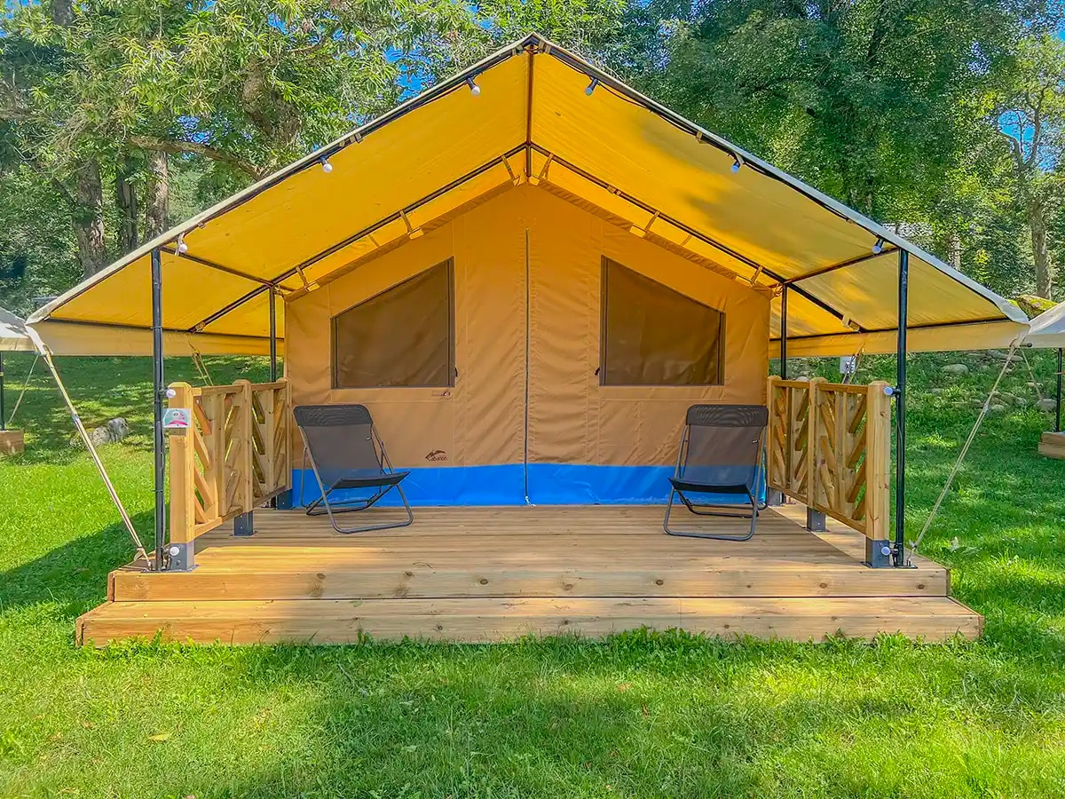 Posez vos valises et écoutez la Nature, grâce à nos tentes sur pilotis. La tente Lodge Canada ou Wood Lodge vous attendent pour un séjour authentique. Installées sur pilotis, ces hébergements toilés vous surprendront par leur espace et leur aménagement ! La Tente Maasaï est la même que ses grandes sœurs, sans pilotis, mais avec une vue sur la montagne… Alors n’hésitez pas ! Les lodges et les tentes Maasaï sont faites pour vous. Pas de sanitaires à l’intérieur, mais les sanitaires du camping sont juste à côté, c’est TOP !